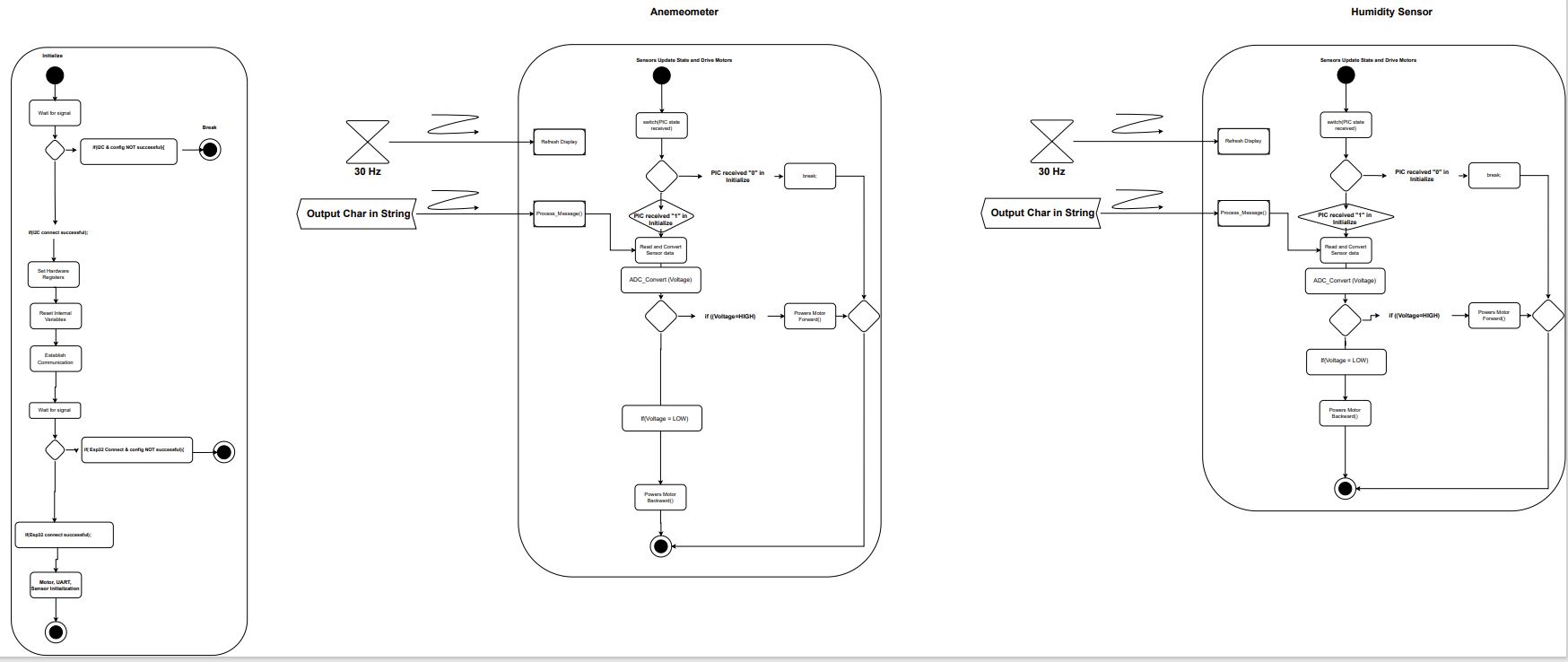 The software diagram satisfies the user needs as it recieves and transmits information from physical sensory input to an electronic device. The anemeometer and humidity sensor will connect to the selected PIC as digital signals. The signals must by assigned to individual variables and combined into a result string. They are then sent to the ESP32 for MQTT uploading to the server.